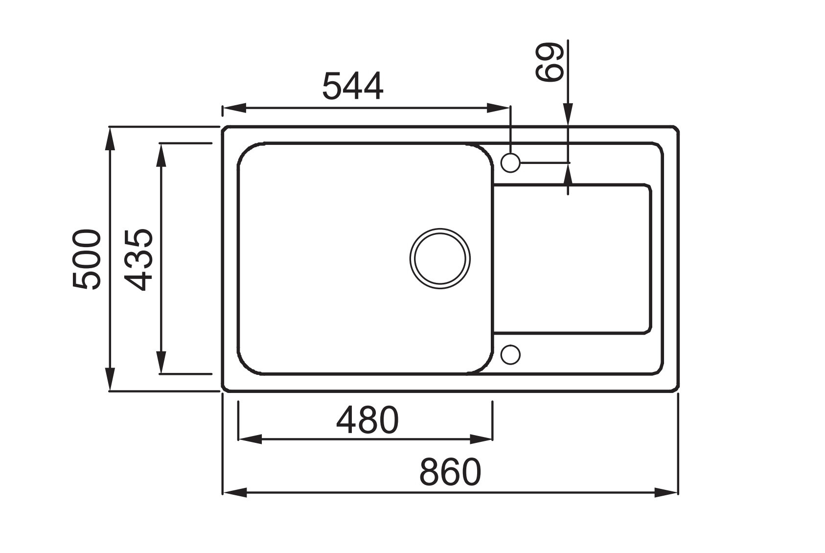 Integrovaná oblast pro příslušenství v odkapávači, vybavená předvrtanými otvory, které vám umožňují instalovat doplňky: excentrické ovládání odpadu, dřezovou baterii s vytahovací sprchou a dávkovač saponátu.