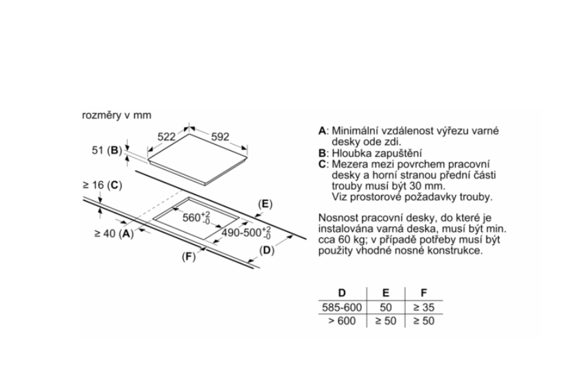 rozměry pro vestavbu (V x Š x H) : 51 x 560 x 490 - 500 mm