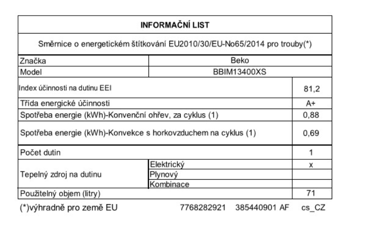 | Objem trouby L | 72 |